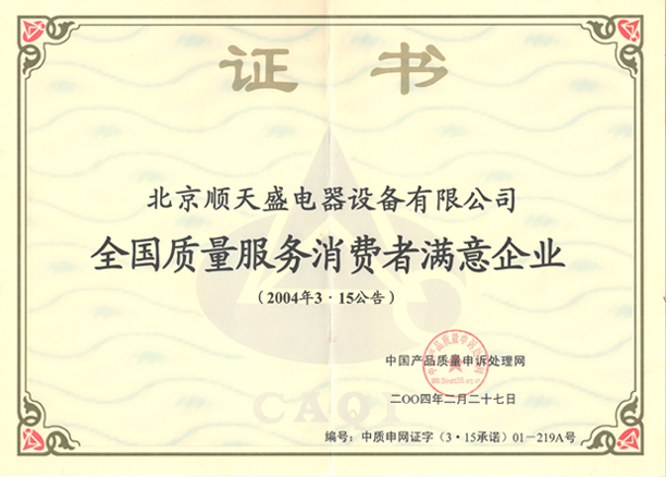 • 全國質(zhì)量服務消費者滿意企業(yè)證書